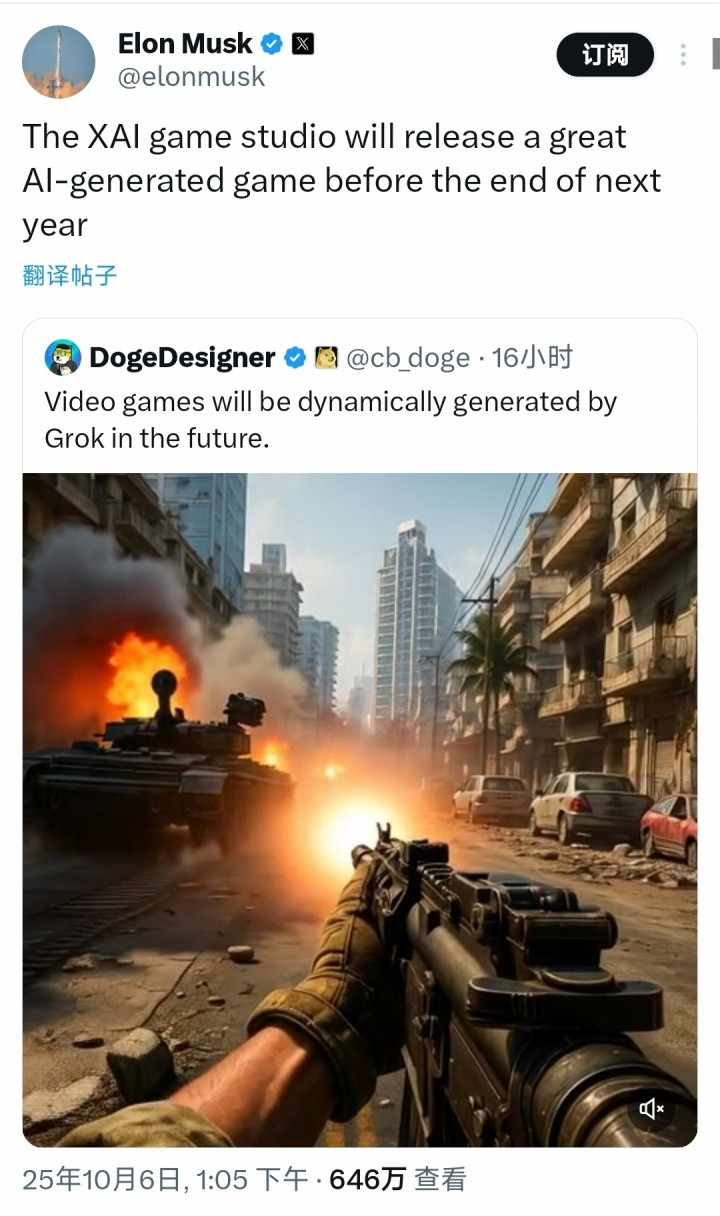 他的这一声明直接发在X平台上,马斯克写道:“xAI游戏工作室将在明年年底前发布一款优秀的AI生成游戏。”